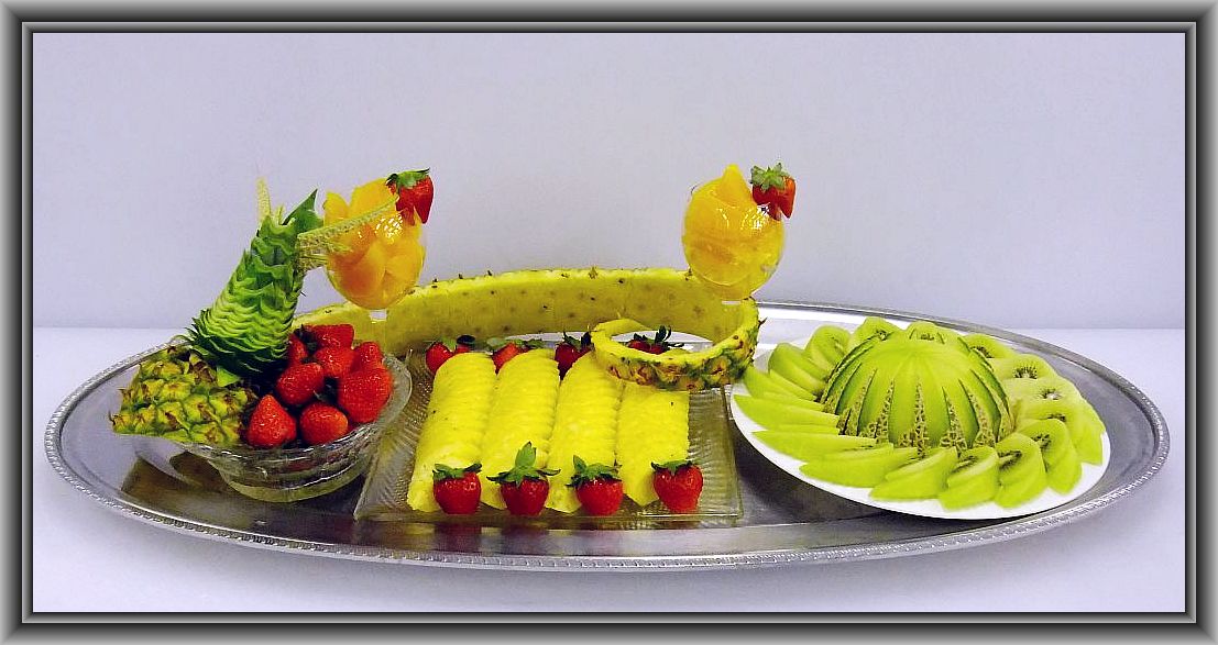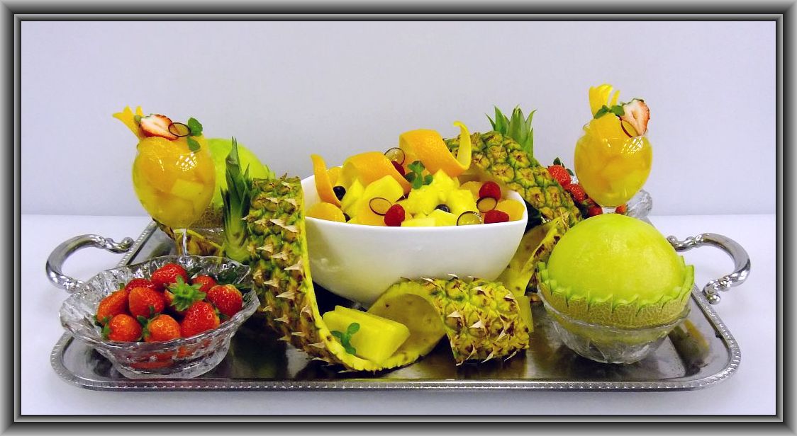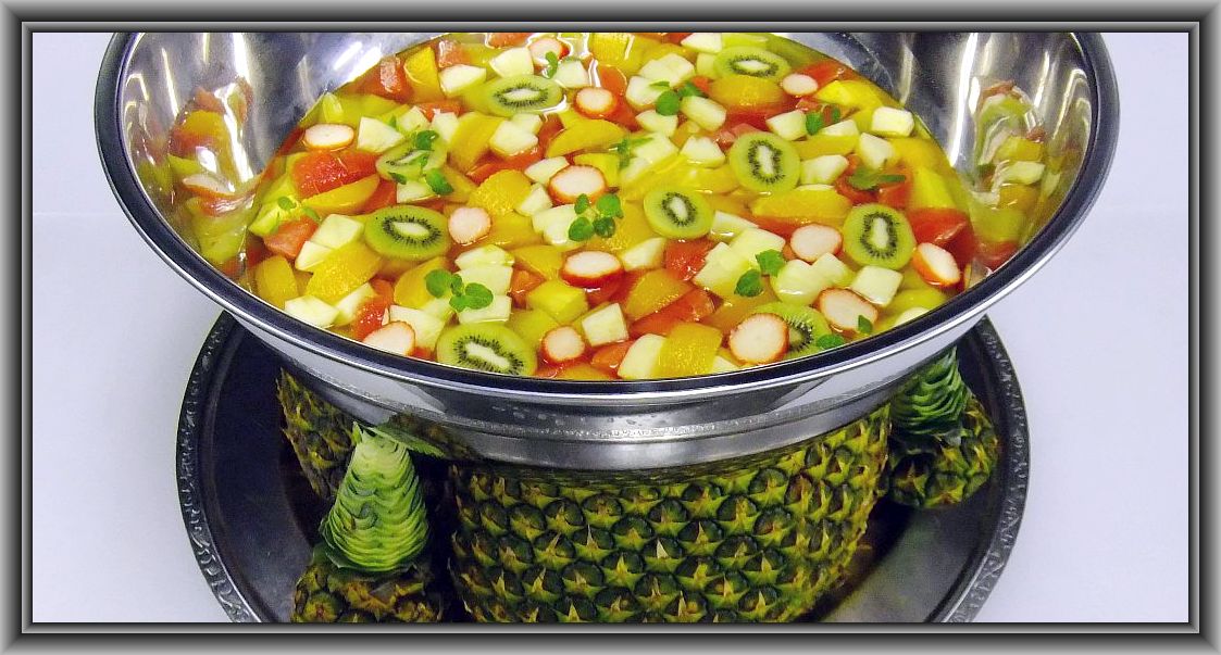 2011.12.16 フルーツ・コンポートです。使用材料はパイン×3本、りんご×2個、オレンジ×10個、グレープフルーツ×2個、キウイ×2個、洋なし×1個、苺、ミント